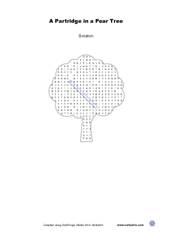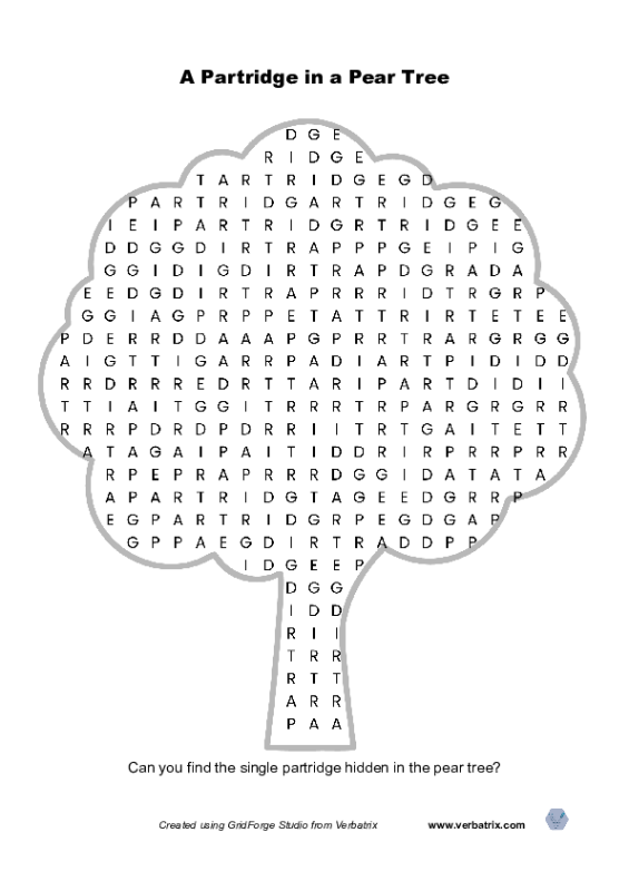 A 'word hunt' wordsearch puzzle. Find the partridge in the pear tree. A single instance of the word 'partridge' is hidden in a tree shaped grid of letters. To make things more difficult, the grid is filled with substrings of the word partridge, eg. 'partri', 'artridge' and so on. Don't forget to download the solution sheet as well as the puzzle.