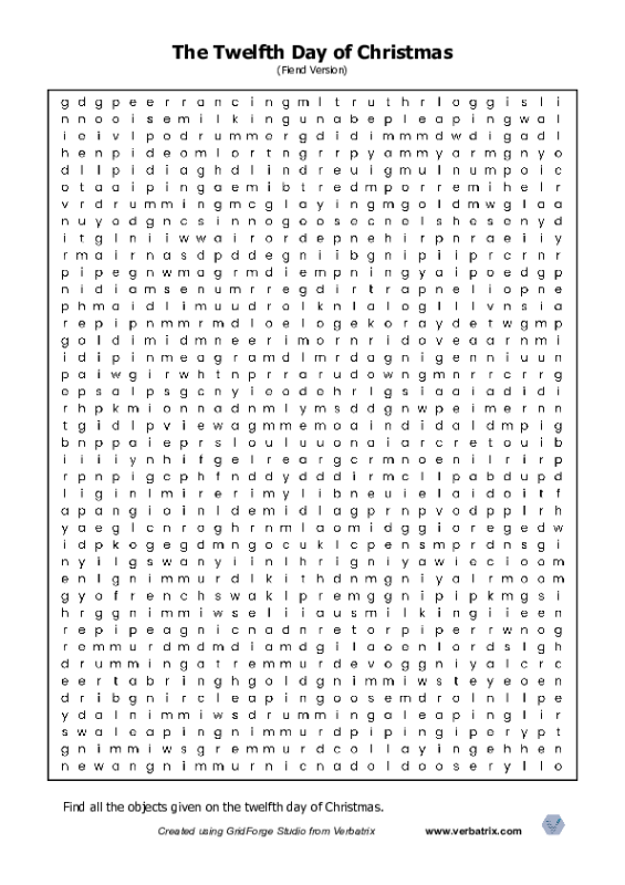 This one will keep you going for a long time ... find all the objects given on the twelfth day of Christmas. In the grid you will find 'French' 'hen' x 3, 'gold' 'ring' x 5 etc. Not only that, GridForge Studio's signature 'Fiend Fill' has been used to fill up the empty spaces in the grid with stems and tails of the placed words, making this a really fiendish puzzle.