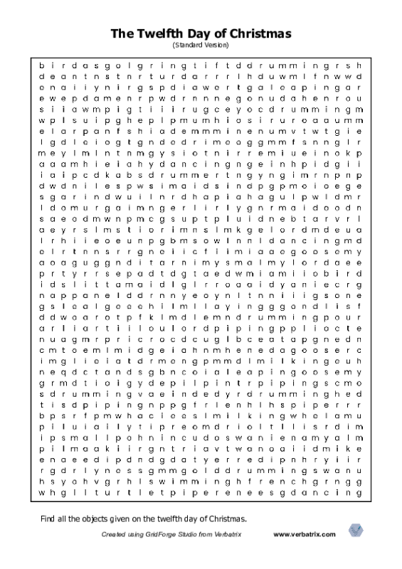 This one will keep you going for a long time ... find all the objects given on the twelfth day of Christmas. In the grid you will find 'French' 'hen' x 3, 'gold' 'ring' x 5 etc. In this version all the words are placed either left to right, down or diagonally forwards (up or down).